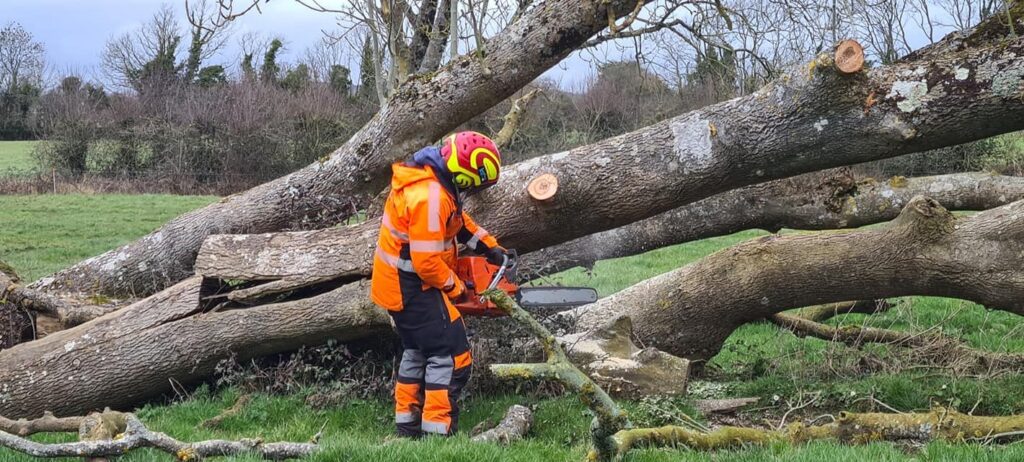 Eksperter bruger specielle værktøjer til at sikkert skære træet ned, ofte i mindre stykker for at undgå ulykker.